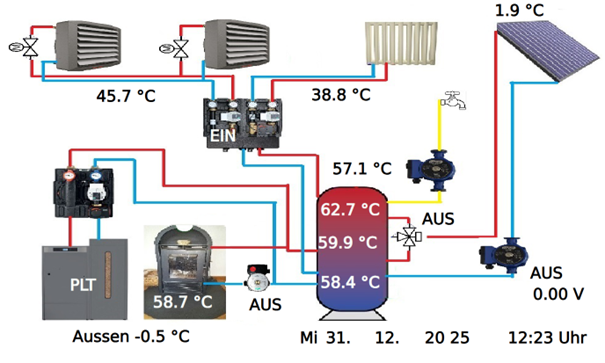 - Automatisierte Energiequelle-Auswahl: Die Steuerung erkennt automatisch, welche Wärmequelle (Solarthermie, Pelletofen oder Kamin) zur jeweiligen Zeit die höchste Effizienz bietet und schaltet diese entsprechend ein. So wird stets die umweltfreundlichste und kostengünstigste Wärmequelle genutzt.